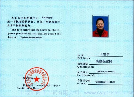1、全國職業(yè)資格考試認(rèn)證中心高級保密師2人